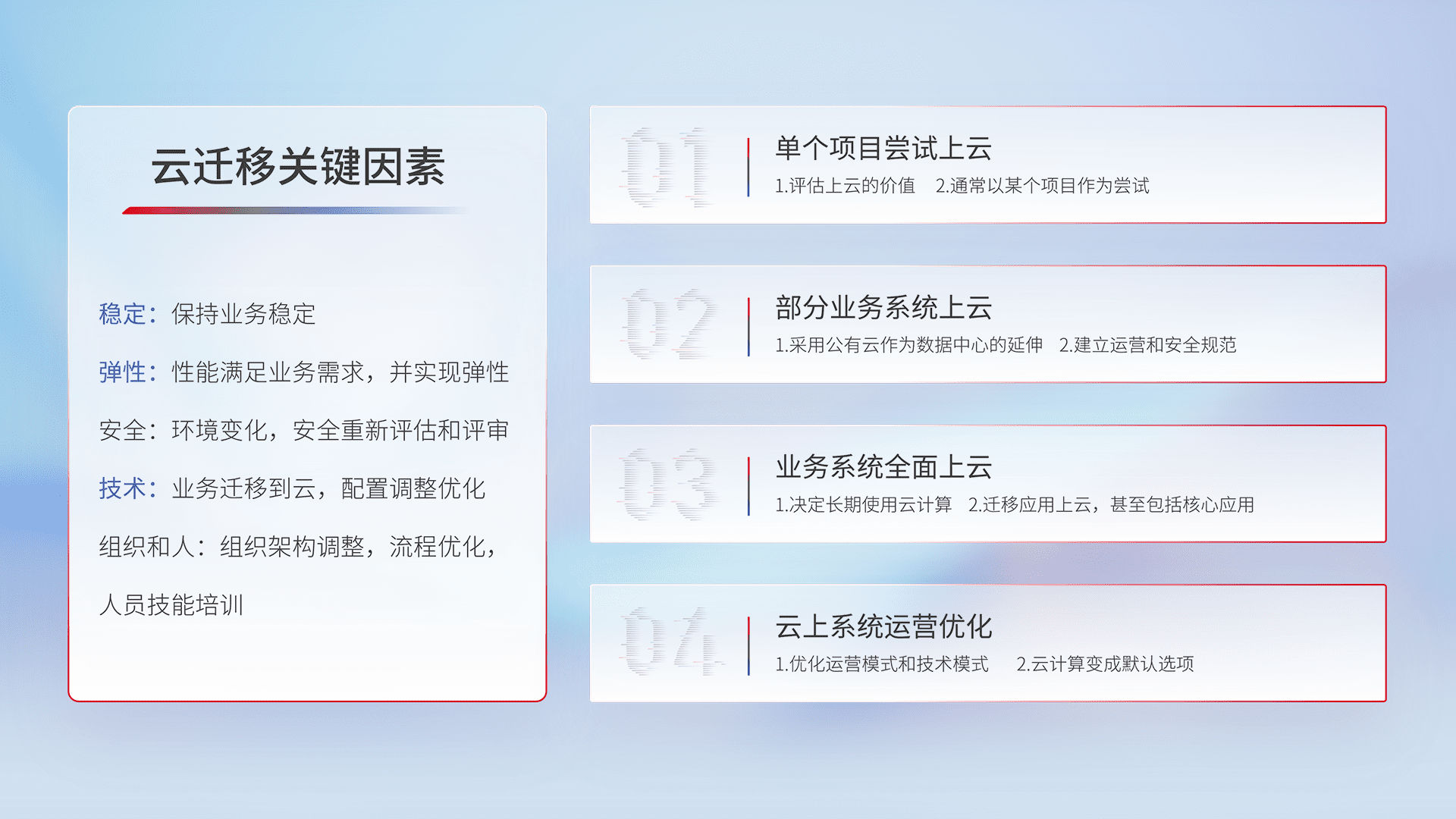 结合实际业务,,,,从规划设计、、、云平台选型、、云原生改造、、、数据迁移、、、、集成交付,,,,迁移全过程为客户识别最佳上云路径,,,,做好风险识别管理,,设计网络架构、、身份权限、、安全审计合规、、操作审计、、日志审计、、、、监控告警策略、、、、多站点容灾设计等,,对云上基础设施进行整体规划,,,提升IT治理水平,,,,以满足弹性、、、高可用、、、、高性能的需求。。。