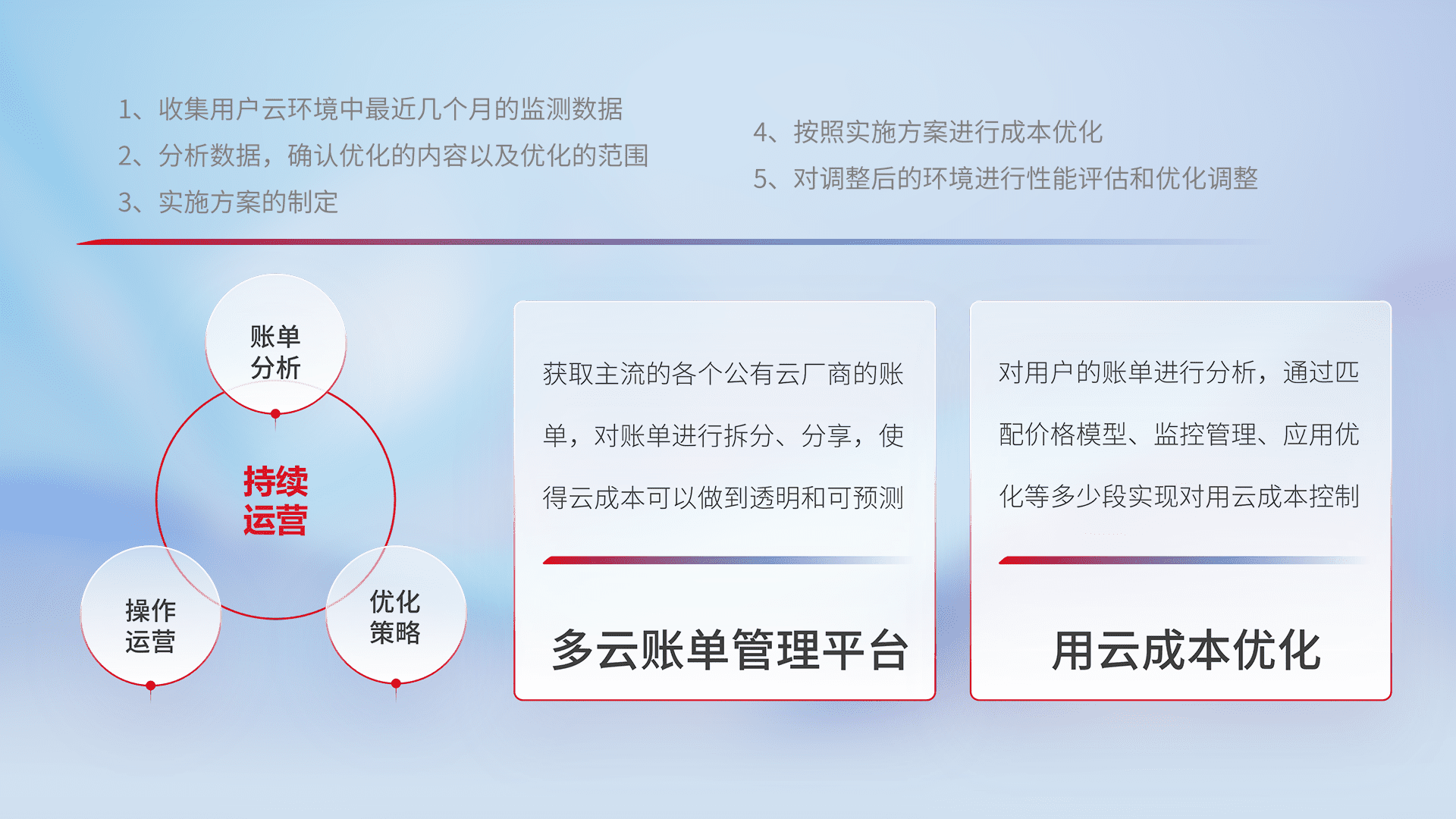 通过多云纳管,,,,以统一的资源数据模型把客户的云资源进行抽象和封装,,,进而实现对多云资源的统一操作,,保障云资源管理的可靠性、、、、稳定性与可用性。。量身定制化运维内容,,,配置、、开发运维、、补丁管理、、备份、、、监控、、、认证和访问管理、、审计和日常巡检等,,,保障在用云过程中的可靠度,,稳定度以及高可用率。。。